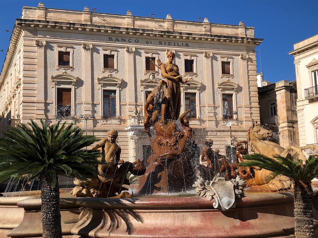 «Старые Сиракузы» расположены на острове Ортиджия, отделенном от материка то ли рвом, то ли проливом. И там тоже, как и в Палермо, зона ZTL, и мы опять мучились со стоянкой и переносом вещей. Но зато там очень красиво. Замечательный древний собор с греческими колоннами и неуместным барочным фасадом. На той же площади — баизлика Св. Лючии, покровительницы Сиракуз, с картиной Караваджио в алтаре. Фонтан Дианы на набережной. Пруд Аретузы – одно из всего трех мест в Европе, где папирус растет «сам собой», его никто не сажал!